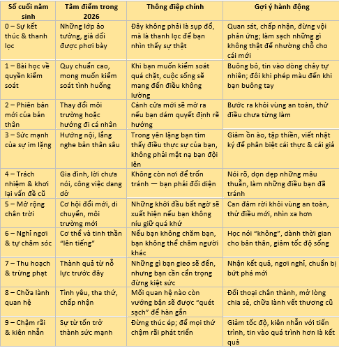 Mỗi con số mang thông điệp riêng, nhưng điểm chung là: năng lượng của 2026 mời bạn trở thành phiên bản có chủ đích hơn, không chỉ bị nhấn chìm trong biến chuyển mà là người kiến tạo biến chuyển ấy.
